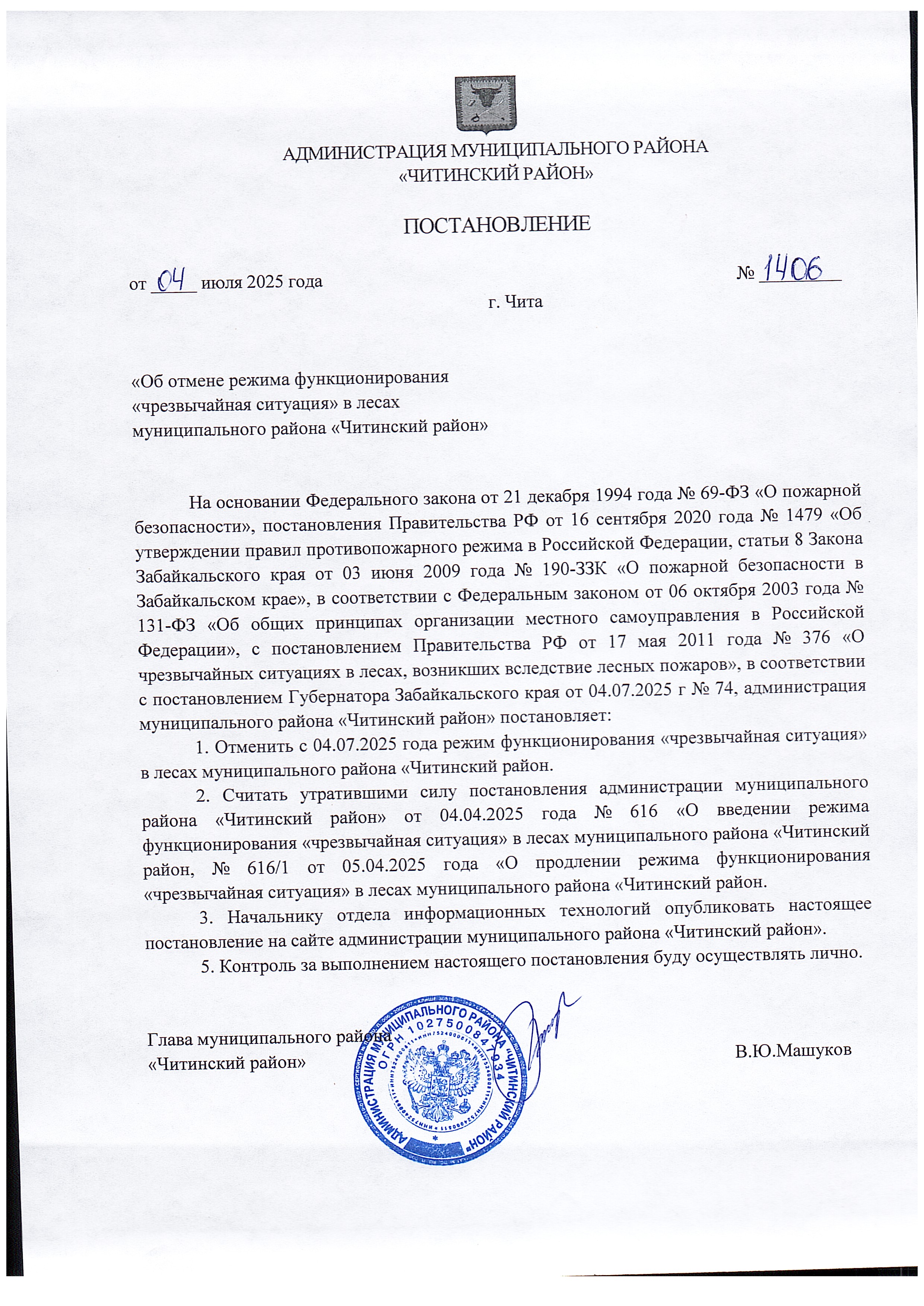 - 07.07.2025: Постановление администрации муниципального района «Читинский район» №1406 от 04.07.2025 «Об отмене режима функционирования «чрезвычайная ситуация» в лесах муниципального района «Читинский район»
